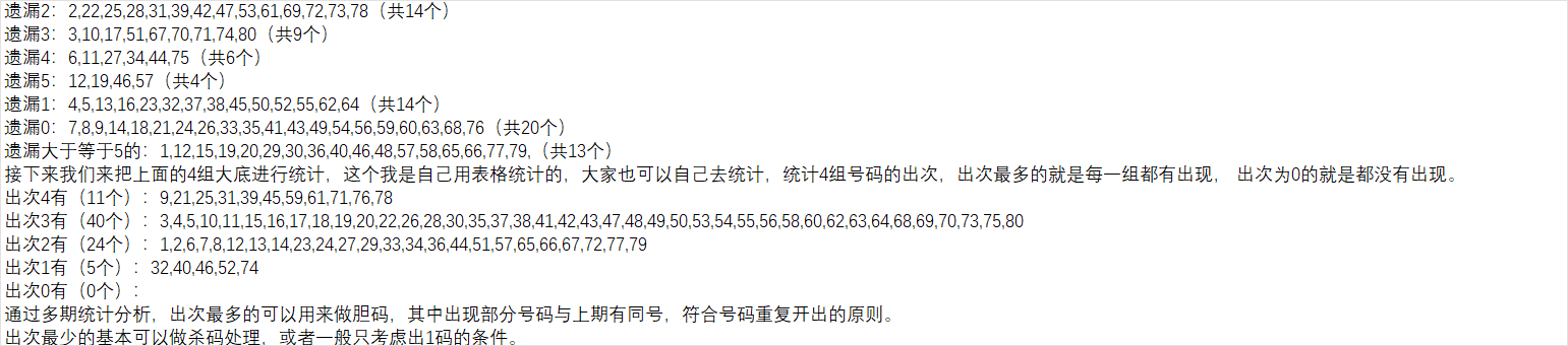 如果把对数和补数合起来有40个号码,中间可能还会产生一下重复数,通过近几期的统计分析,以上期数据进行补数对数计算推算下一期的概率不高。为提高概率,我主要是用前两期的数据来进行对数补数推算,然后再组成一个集合,作为我的第四组大底号码。