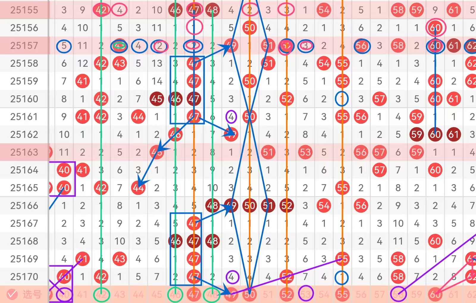 三区间给到主做号码球:43 45 47 52 53 60;防守号码球:44 46 49 50 55 58;
