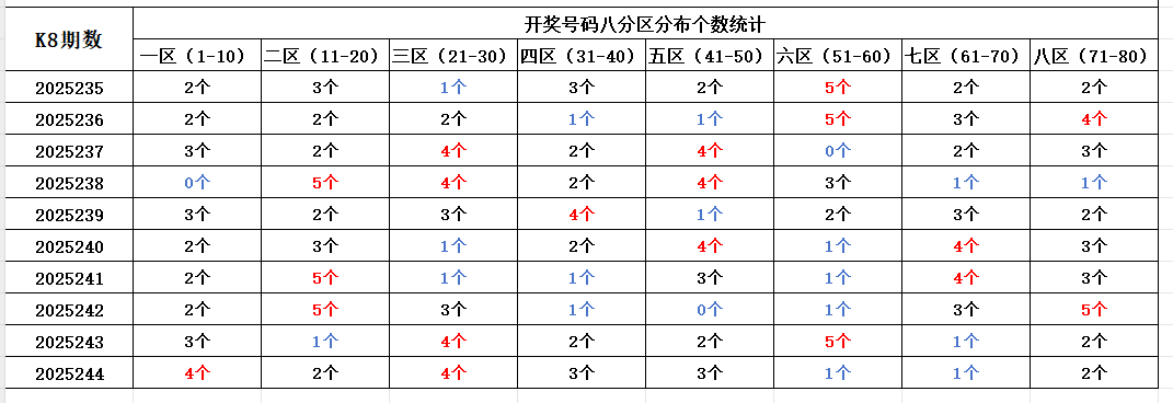 首先看上期回顾,“快乐8”第25244期开奖结果:2.3.6.10.12.16.23.25.28.29.34.35.38.42.44.47.58.64.73.80;通过分析开奖号码,分享第一个数据分析:统计开奖号码的八分区冷热走势,判断出号规律。以近10期开奖号码的八分区统计数据为例: