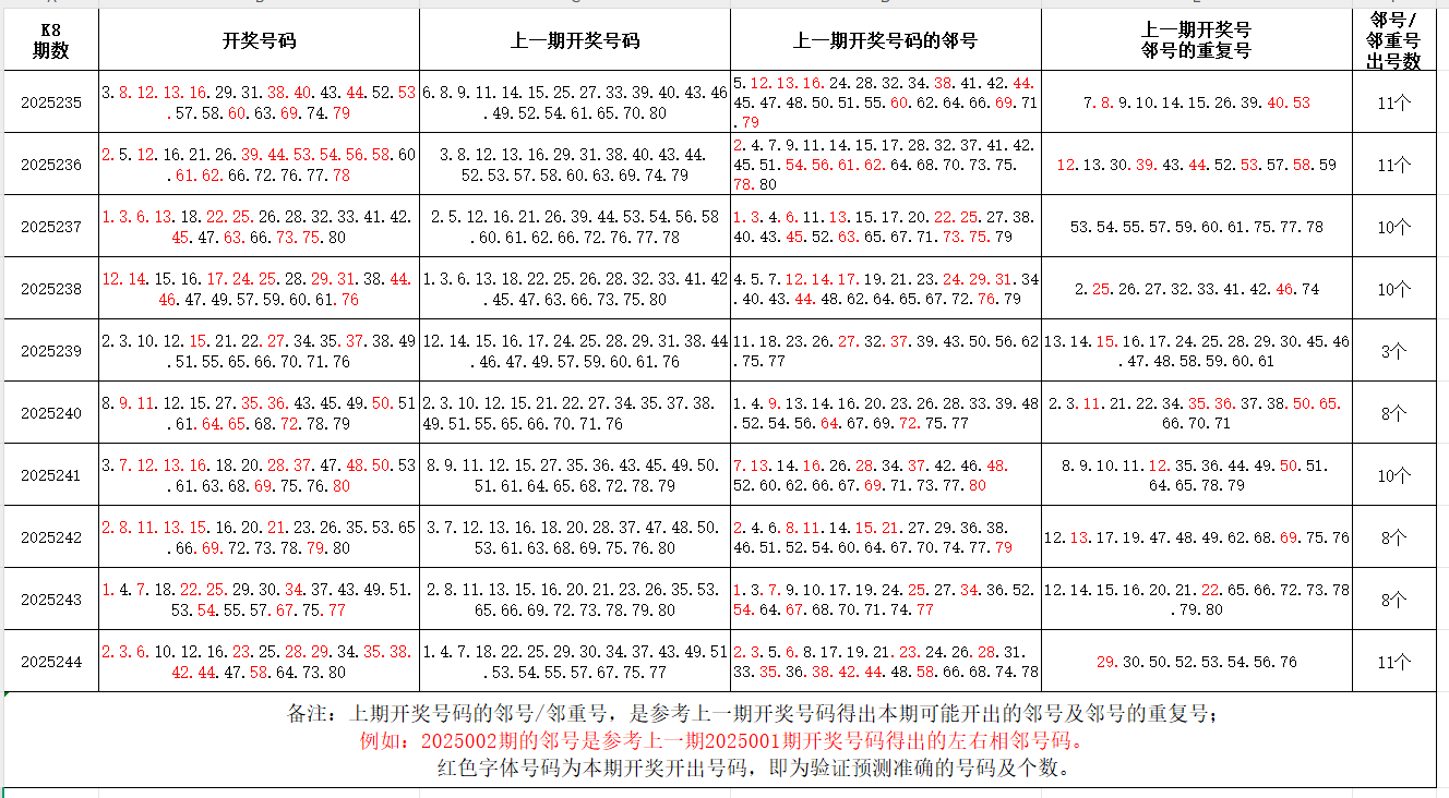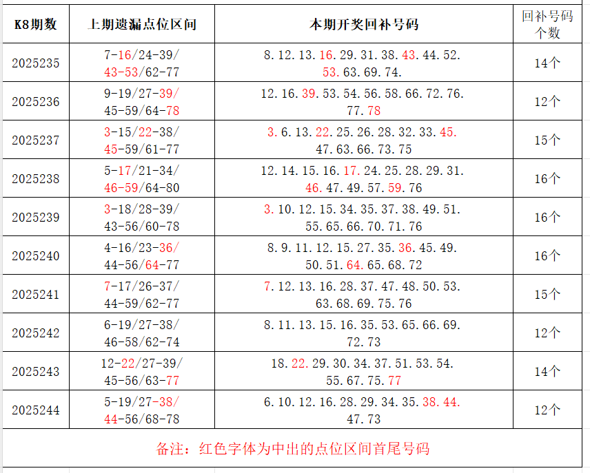 如图,上期的遗漏号码在下期开出10个左右,即为回补号码。定准点位区间首尾号码是关键!以上期2025244期为例,定位4个遗漏区间,围中12码!结合上期开奖号码,以跨度值大于或等于7为依据,本期关注4个遗漏区间:16-23/47-58/64-73/73-80;重点关注遗漏区间:11-24/33-43/53-67/70-80,区间遗漏号码可能在本期回补开出。注意区分遗漏区间回补号码和大底号码,不要混淆。个人分析,仅供参考。