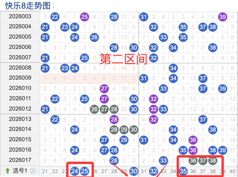 ·上期二区开出5个奖号(28.33.36.37.38)上期回顾二区开出5个奖号二区间在上期落位同比前期的话呈现了一个不变的落位趋势,先来看本期号码24整体活跃度较,在近 30 期里有一定的间歇性出现,不是每期都开,近期整体走势还是很稳定。号码25近期热度较温热,间隔性还是很好,说明其在当前阶段活跃度较温热注意防守。号码30近期活跃度较温冷,有一定的间歇性近期整体走势相对不是平稳有特别明显的冷热趋势变化,号码3530期内活跃度较温热,没有明显的连续出现形态走势,整体表现比较动荡是很稳定。