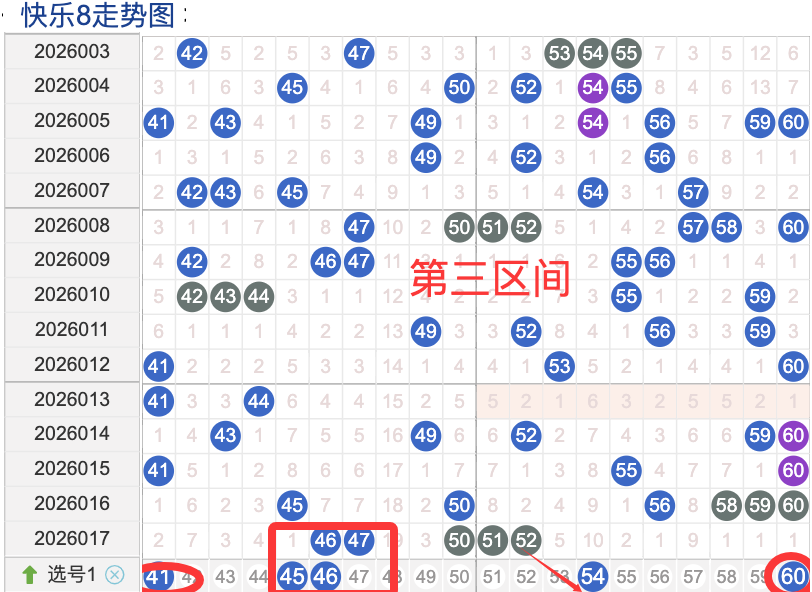 三区间开出了5个奖号(46.47.50.51.52)上期回顾三区开出5个奖号上期的三区间的奖号数量呈现一个递减的形态,4头回补2个号码,本期先来看号码41近期出现频率相对来说是很稳定。偶尔有时间隔期数也是很长,说明其在近期的开奖中较温热的,号码45在近 30 期内出现次数相对较稳定的号码,近期的活跃度也是较温热。号码54有一定的间歇性,通常间隔5-3期会出现一次,没有明显的连续出现态势,走势相对较温热,在整个第三区间的表现本期还是可以防守的。号码60走势相对近期较温热,近期没有连续间隔落号的情况,活跃度近期处于较温热状态注意防守。