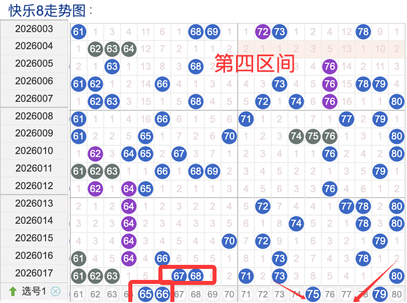 上期四区间开出了8个奖号(61.62.63.67.68.71.73.80)上期的四区开7个奖号呈现了一个递增的趋势,开出的奖号7头回补2个6头回补5个,先来看号码65在近 30 期内属于还不是很稳定的号码,近期出现频率相对也不很稳定的,偶尔会间隔多期后出现一次,这个号码要注意防守,号码66具有一定的间歇性活跃度较稳定比如有时会间隔 35期就再次出现,也有时会间隔多期,近期整体出现频率比较温热,近期还是要关注的.号码75活跃度近期比较温冷,有一定的间歇性。活跃度近期较一般,整体走势有一定的波动性.