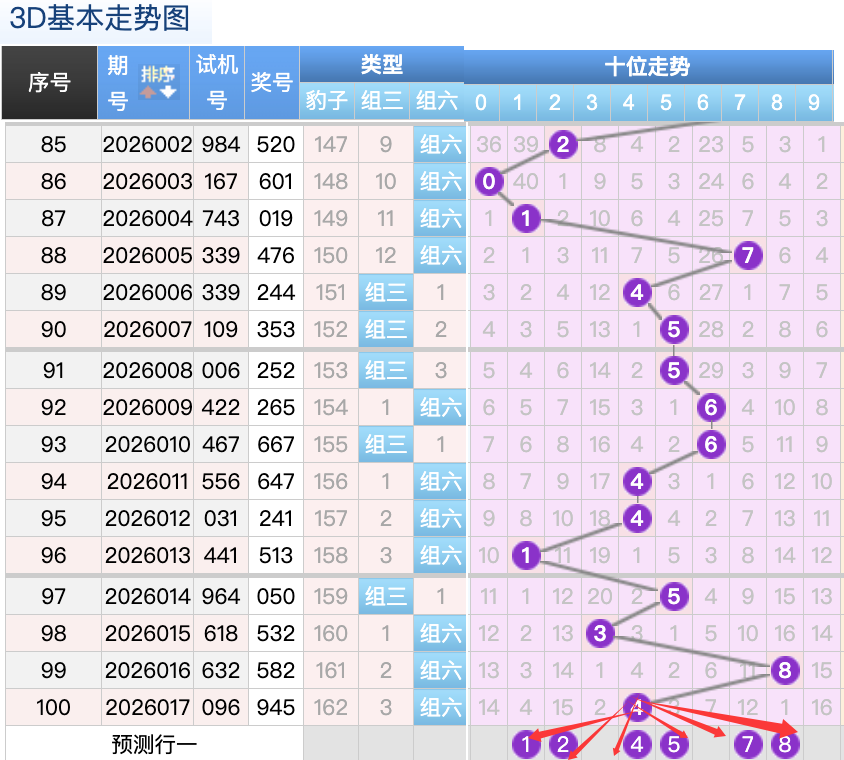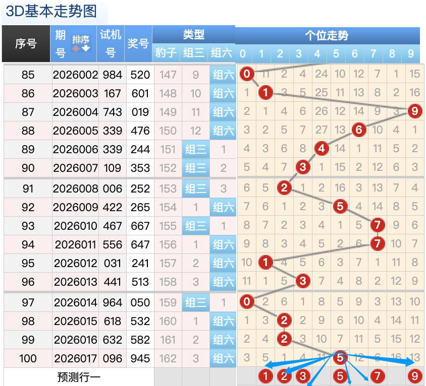 上期的3D个位开5号球,上期开出的是组按照形态的话本期打组六形态,上期的5号球的落位是个位上的一个3跨的落位趋势,本期先来看4号球在个位还是有机会继续走出小号落位点这里要注意是一个顺位的落位点,9号球和7号球是这里的落位点是两个冷热号码的落位点这里注意防守一码就好了也是这里的两码走势都是非常好看的注意选择一码,再看5号球这里注意继续走重码的落位形态