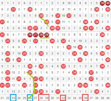 26:咱们继续看图,26还是很热的,近15期内开出5次,两次都是两连重号,上期右邻号,27开出三重连号,本期看好26延27左斜连下来。