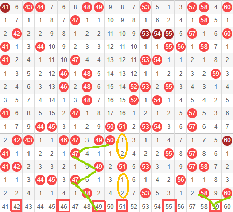 49: 如图,47.49号码走势Z型,上期开出中间的48,本期看好右斜连下来,落49,且49可重点关注。