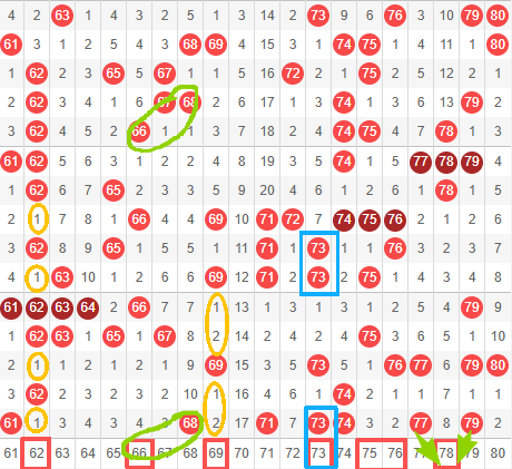首先我们看下上期数据,和值为880。  奇偶比例为:10:10。   出了三组双连号,分别是27+28,60+61,73+74,   直连重号出了4个,分别是06,10,27,74,其中06,10,74为两连重号,27为三连重号。未出现断层区域。我们把 01-40划分为前区,41-80划分为后区,则小号偏多,均为热号和温热号。