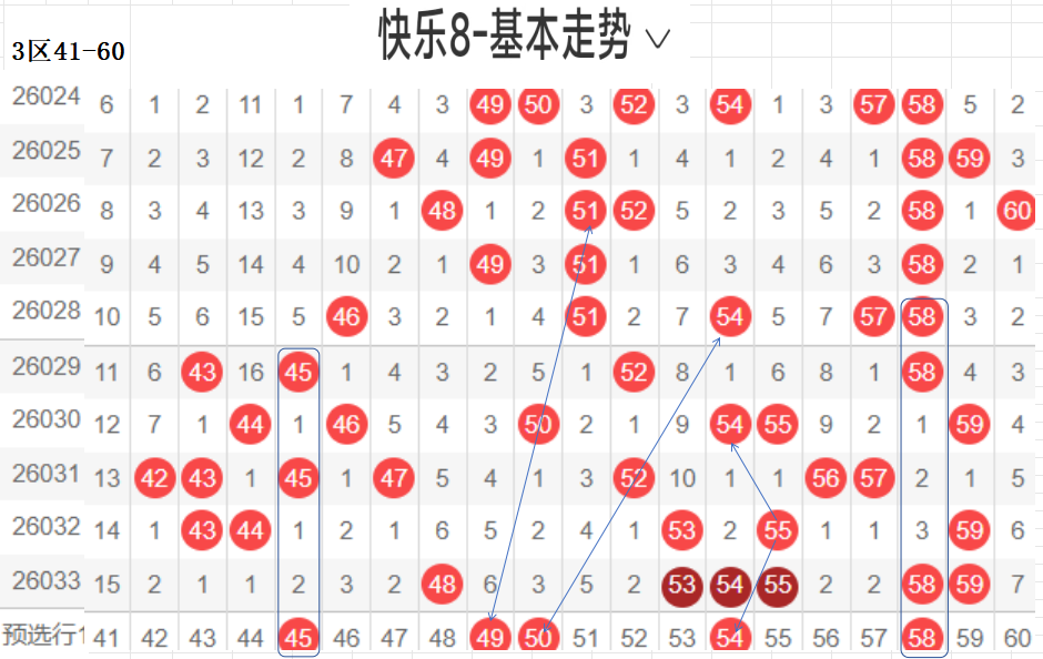 三区(41-60):遗漏5期以下有18,048 53 54 55 58 59  6,温开方式,这区码数有回暖之意,可以防一手,先定胆码走势较大者,隔期,斜三连,分边号码,可重防,间隔5以上号码可以随走势选取,例如本期大冷码,走势比较大,可以做胆,通常联动可带出,分边对称的号码,本区间也有很大走势.可关注下.隐形夹角号码.做补位形态号码.都需要观察动态走势.以上是本区间的选码方法.