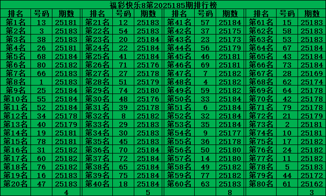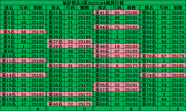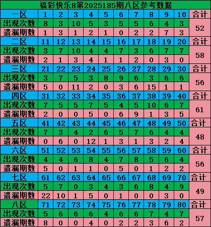 最后再把号码分为五区:一区01-16号、二区17-32号、三区33-48号、四区49-64号、五区65-80号,理论上每个区每期应该开出4个号码,2025184期五区比例:1:5:4:3:7