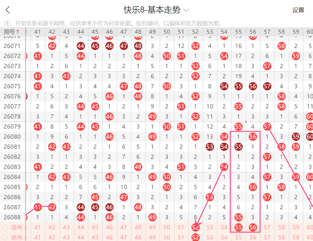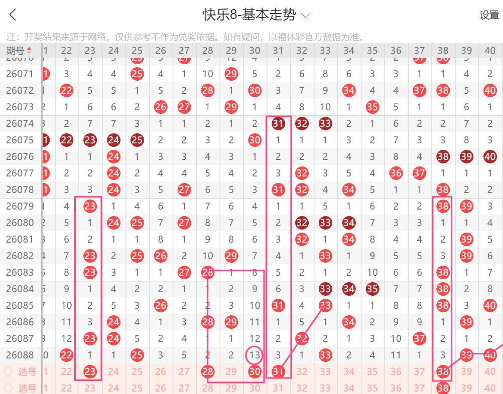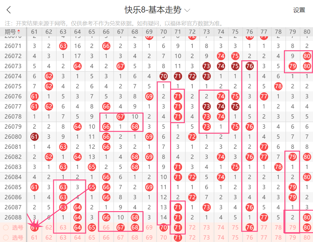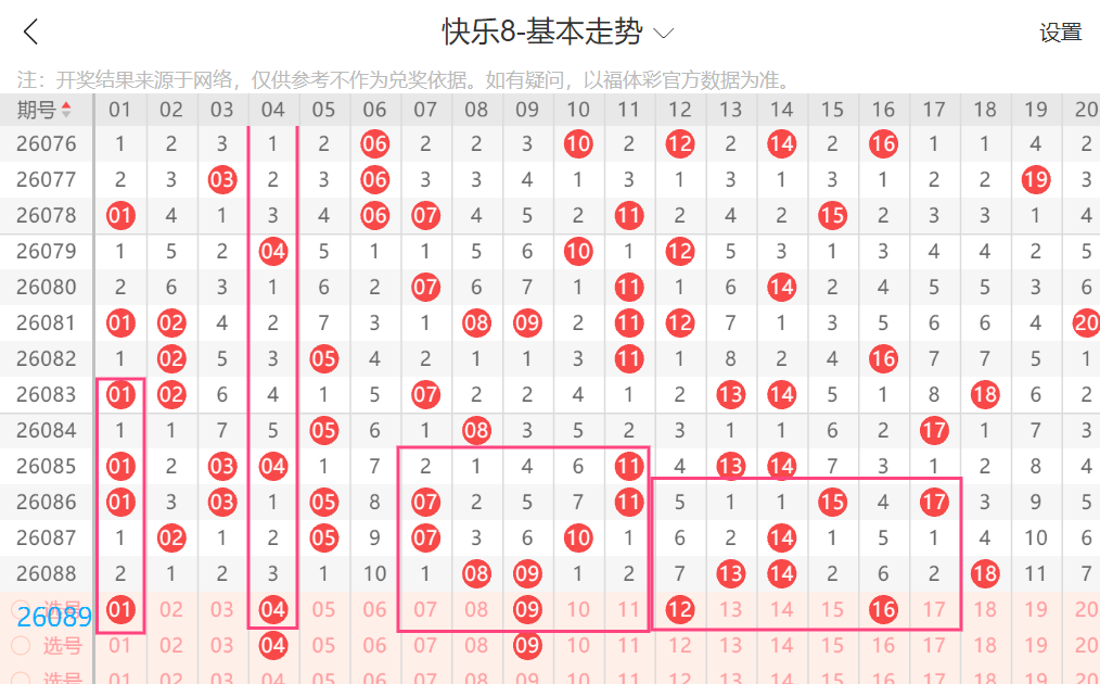 综上分析:快乐八第26089期走势遗漏形态分析,本期大底和区间胆码如下: