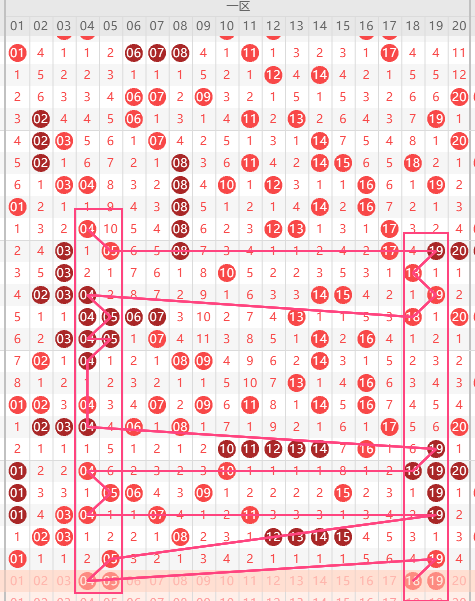 第一区间的走势分析:第一区间上期开出了3个号码球,主要的落号点位在一区间5号位,走出了3的形态走势,上期一区间的落下了7个号码球整个一区间处于走热的趋势,根据一区间的走势规律,今天的一区间我们主看4热码,走出了斜称的走势形态,再看后半区18-19对称的回补,落下一码的机会很大,这三个号球重点关注45的组合以及1819的组合,防守4-5-18-19组合