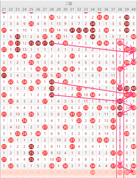 第二区间的走势分析:第二区间上期开出了6个号码球,属于前半区1个,属于后半区热码的走势,根据二区间的走势规律,今天的二区间我们主看半区38的回补,走出了上下对称的走势形态,再看二区间前区位置28这个号码球的落位,重点关注22-39-40组合