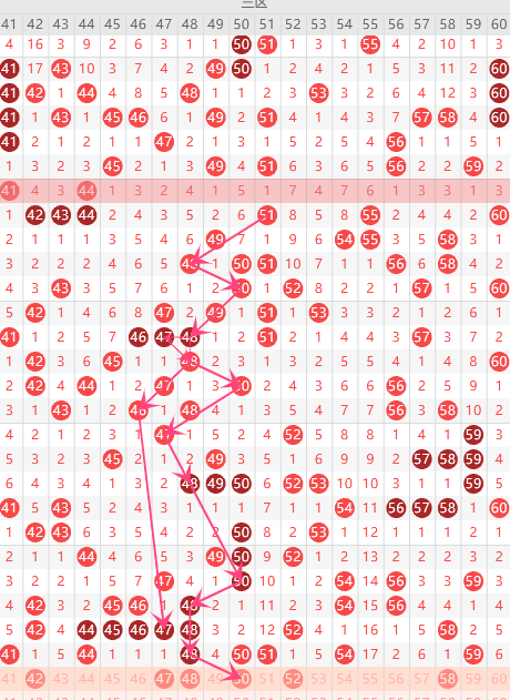 第三区间的走势分析:第三区间上期开出了7个号码球,主要的落号点位在三区间的前半区,走出了13的形态走势,上期三区间的前半区落下了4个号码球,后半区落下了3个号码球,整个三区间处于走的趋势,根据三区间的走势规律,今天的三区间我们主看半区龙头位置4248组合的落位,48属于热码的走势,48走出了连期对称的走势,重点关注47-48-50组合这个号码球的落位