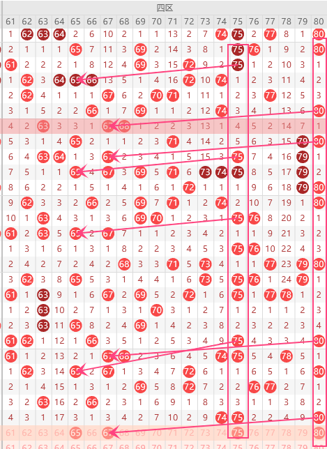 第四区间(61-80)第四区间的走势分析:第四区间上期开出了3个号码球,主要的落号点位在四区间的后半区,走出了12偶的形态走势,上期四区间的半区落下了3个号码球,整个四区间处于偏冷的趋势,根据四区间的走势规律,今天的四区间我们主看半区75这个号码球的落位,根据以往75的落球规律。重点关注65-67-75组合