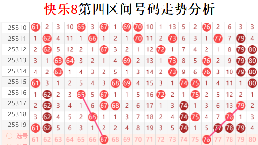 四区上一期两组连码联动,龙头开出两连,凤尾开出三连码,中部走势空缺。这里注意一点就是重号目前依然在延续,那也就证明本期重号依然是可操作走势。不过本期四区在面临回补和主线的拉扯上还是存在较大分歧。重号聚集于62-63与78-79两段,形成双簇并立格局,需防其一扩张成势。建议重点关注62-63段重延续动能,防范78-79凤尾三连扩张为四连形态。同时关注70号中轴位的横向补缺机会,70号作为中区枢纽具备承上启下作用,70号若在本期实现点火,则有望带动中段72-74形成补位联动。