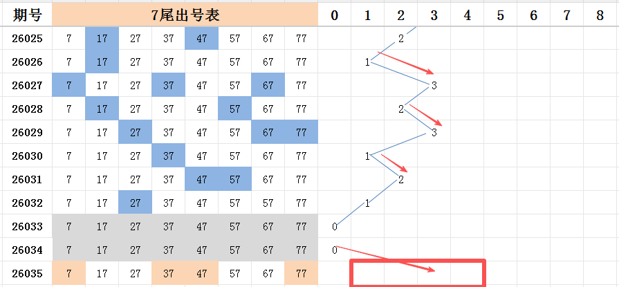 本期看好开出的范围是两码走势至四码走势之间。上期七尾还是断尾的走势,那么近期的七尾就走冷了,这种尾号走势不太好判断,那么就从看好的区间就选择比较不错的号码。一区的号码07,四区的号码37,五区的号码47,以及八区的号码77都是比较不错的区间内的号码。