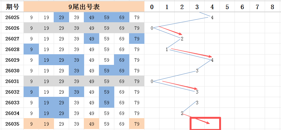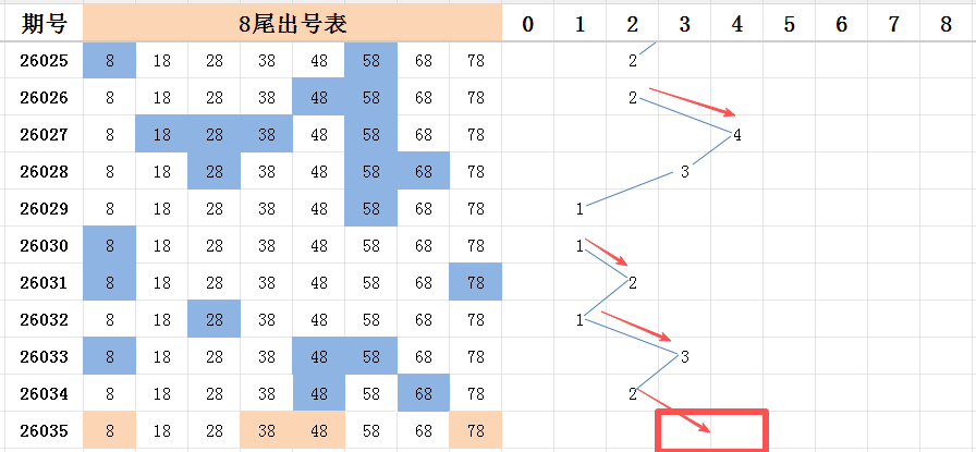 本期看好开出的范围是两码走势至四码走势之间。八尾上期开出两码走势,本期八尾不错的号码有,两个三斜连的号码38和78,看好能开出其中一码,重号看好48,也是三连号的号码走势。号码08是间隔三连号的号码走势,也是不错的号码。