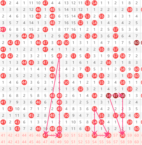 三区分析:【41-60】(走势图标注号码非小黄车大底,请谨慎参考,具体思路将在直播间分享讨论)