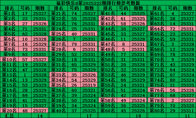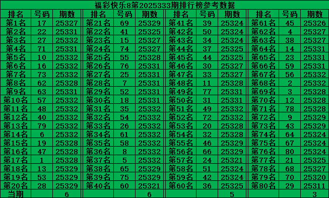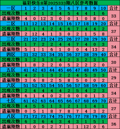 最后再把号码分为四区:一区01-20号、二区21-40号、三区41-60号、四区61-80号,理论上每个区每期应该开出5个号码: