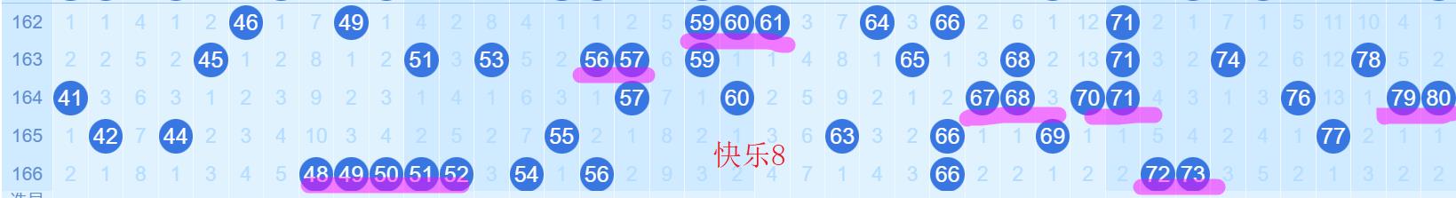 近五期开奖第一分区出号数量为5+5+3+5+8=26枚,占整体比例26%;第二分区出号数量为8+5+7+4+4=28枚,占整体比例28%;第三分区出号数量为3+3+7+6+4=23枚,占整体比例23%;第四分区出号数量为7+4+5+4+3=23枚,占整体比例23%。基于波动趋势衡量以及动态平衡干预,本期号码分布倾向于第一分区和第三分区。基于动态平衡干预,本期选号重点关注周期遗漏的5,9,10,12,14,17,43,47,58,重点排除超出周期均值的26,31,66,71。