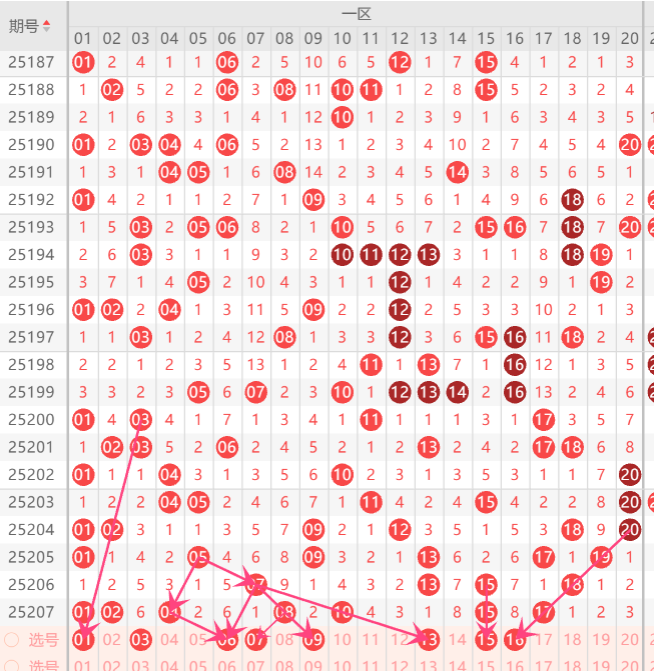 一区在近期的走势形态来分析,上期再次开出了7码,而且区间开出的形态是重码回补和对称形态走势,上期小妹在文章里不觉到了5码开出,那本期的重码上注意01.08.10.17.中走重一码机会,而且还要防守15走三重机会,至于空位回补上注意06.12.中防守机会,而重码回补上的03.13.16.20中开出一码机会,如图所示。