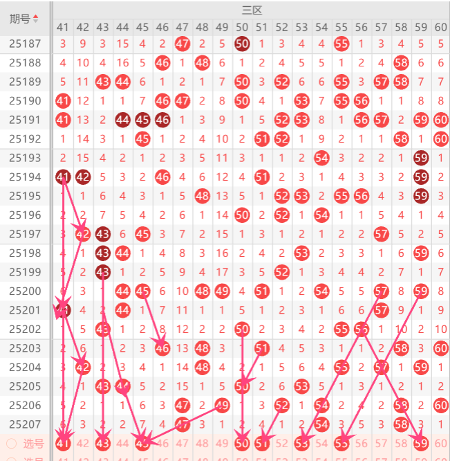 三区间在近期的走势上分析,上期三区间区开出了3码,而且整体区间开始走温冷形态,上期三区间开出的形态是重码走势,上期小妹在文章里布局到了2码开出,上期三区间开出了三码走重码,那么本期在重码上就防守三码中一码走三重机会,而对称形态上的41.43.53.59.中开出1-2码机会,那本期还要注意这重码分边上的53.55中参考一码分边,如图所示。