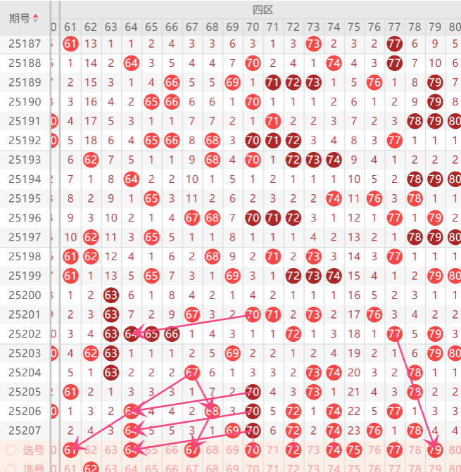 四区在近期的走势上来判断机会的话,整体区间上期开始走热形态,上期四区间开出了7码,而上期区间开出的形态是重码和斜连号走势,上期小妹在文章中布局到了2码开出,那本期四区间的重码上注意防守70号走四重机会,至于重码回补上的63.79中开出一码机会,而四区的斜连号下拉位置上注意防守75.79中开出一码机会,如图所示。