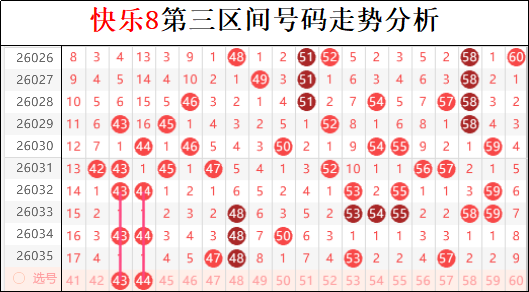 二区上一期焊死三码开出两码,属实有点遗憾。本期我们来看二区已然呈现递减走势个数,所以二区本期依然是温态布局的可能性比较大。二区连码大概率在28-31或35-38之间卡位补缺,斜连结构已悄然向41、42、43方向延伸——注意!目前最大的依仗就是四连之后两连未消失,所以本期布局上不妨考量连码的再度来袭。不过点位上很显然有点不合理,后端连续走空,这与一区的连码之下连续五期比较类似。尤其是前端面临完美的阶梯下拉走势,中端三重开始破位,必然会有一个形态是下拉的。