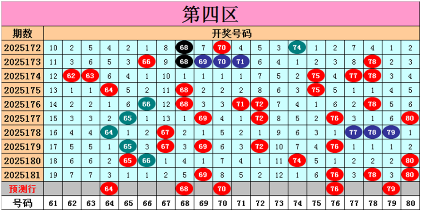 目前第四区包含9个热码:重码4个69、76、78、80,邻码0个,孤码5个65、66、67、72、74;包含6个温码:邻码4个68、75、77、79,孤码2个64、71;包含5个冷码:邻码1个70,孤码4个61、62、63、73;号码冷温热个数比为5:6:9,重号、邻码、孤码个数比为4:5:11。