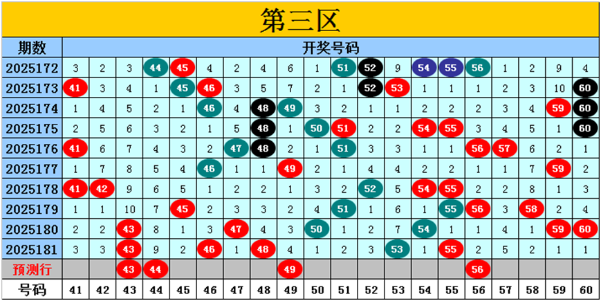 目前第三区包含14个热码:重码5个43、46、48、53、55,邻码4个45、47、54、56,孤码5个50、51、58、59、60;包含5个温码:邻码3个42、49、52,孤码2个41、57;包含1个冷码:邻码1个44,孤码0个;号码冷温热个数比为1:5:14,重号、邻码、孤码个数比为5:8:7。