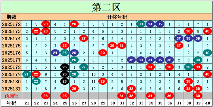 目前第二区包含9个热码:重码4个26、32、38、39,邻码2个25、40,孤码3个21、22、29;包含9个温码:邻码4个27、31、33、37,孤码5个24、30、34、35、36;包含2个冷码:邻码0个,孤码2个23、28;号码冷温热个数比为2:9:9,重号、邻码、孤码个数比为4:6:10。