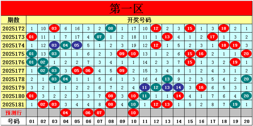 目前第一区包含12个热码:重码7个02、03、08、10、12、13、19,邻码4个01、11、14、20,孤码1个16;包含5个温码:邻码2个04、09,孤码3个05、06、15;包含3个冷码:邻码2个07、18,孤码1个17;号码冷温热个数比为3:5:12,重号、邻码、孤码个数比为7:8:5。