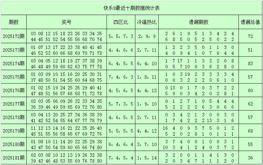 一、快乐8第2025182期奖号分析(定义:遗漏0-2期号码为热码,遗漏3-6期号码为温码,遗漏7期及7期以上号码为冷码,重码为上期开出奖号,邻码为上期没有出现,但与上期奖号差值为1的号码,例如上期开出奖号04,没有出现号码03和05,则本期03和05都为邻码,其它则为孤码。