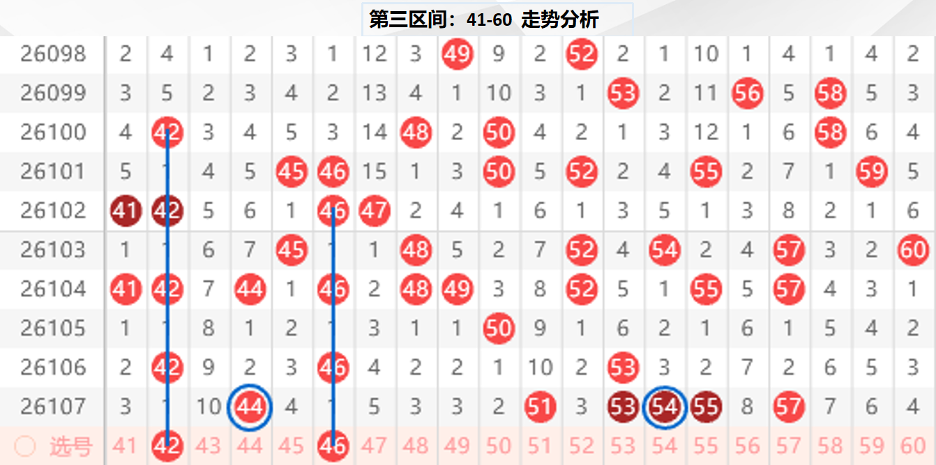 三区分析:【41-60】(走势图标注号码非小黄车大底,请谨慎参考,具体思路将在直播间分享讨论)