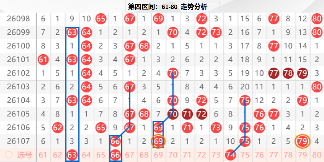 四区分析:【61-80】(走势图标注号码非小黄车大底,请谨慎参考,具体思路将在直播间分享讨论)