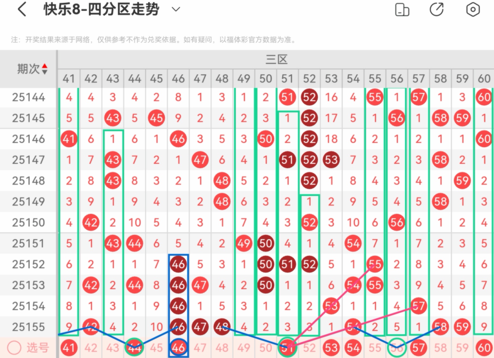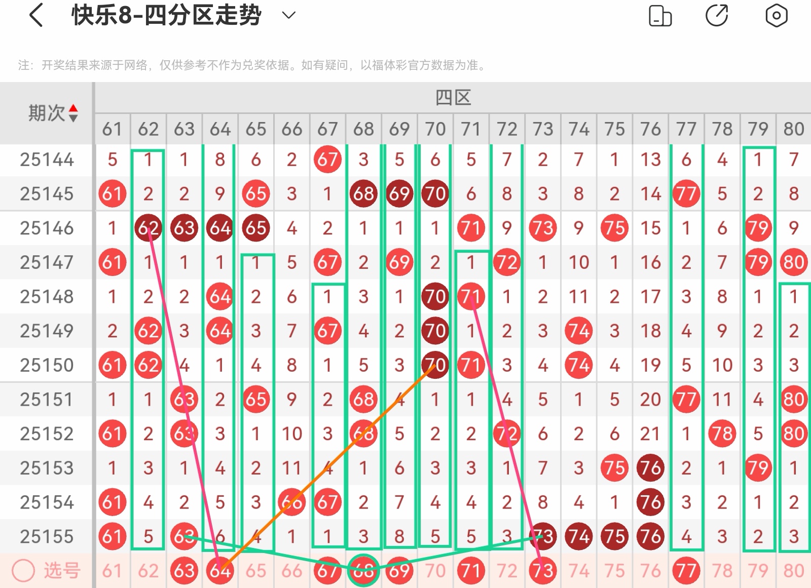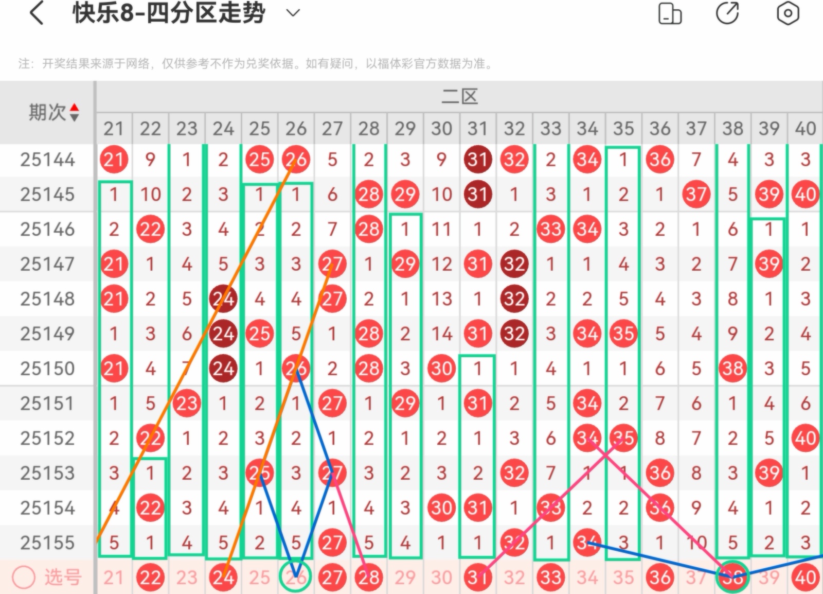 大家好,我是甜丝丝的坏事,主要以快乐八的形态走势、空位走势、遗漏走势以及斜连走势相结合的方法,用公认的四分区走势来进行预测分析,希望能让你有所收获。