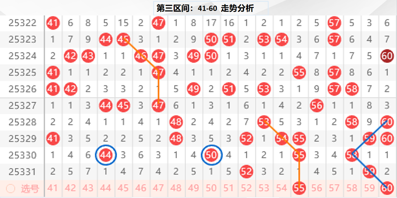 三区分析:【41-60】(走势图标注号码非小黄车大底,请谨慎参考,具体思路将在直播间分享讨论)