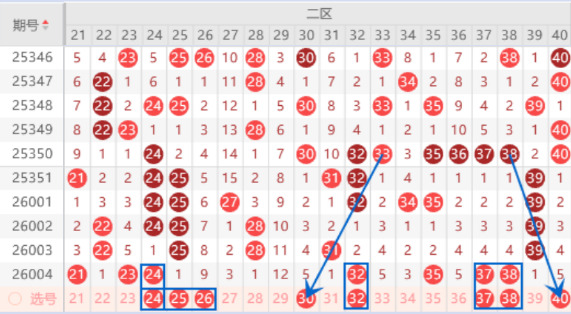 该区间上期开出了21 23 24号数字,本期我们注意一下出一个重号的情况,其中的23 24号数字可以关注一下。本期的25 26号数字我们注意一下出一个号码的情况,其中的25号数字可以重点关注一下。本期的30号数字是属于四斜连号码,出号机会是有的,可以关注一下出号情况。上期开出了32 35 38号数字,本期我们注意一下出一个重号的情况,其中的32 38号数字可以重点关注一下出号情况。本期的40号数字是属于三斜连号码,出号机会也是有的,可以关注一下。