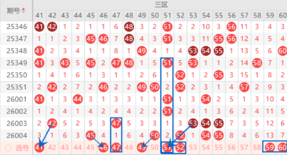 该区间的41号数字是属于123走势,本期可以防守一下出号情况。本期的46我们关注一下出号情况,本期可以防守一下46 47号数字同出的情况。本期的49号数字我们注意一下出号情况,属于424走势号码,本期可以防守一下42 49号数字同出的情况。上期开出了50 52 54 55号数字,本期我们注意一下出一个重号的情况,其中的52 55号数字可以重点关注一下出号情况。本期的51号数字是属于空二对称号码,出号机会是有的,可以关注一下出号情况。本期的59 60号数字我们注意一下出一个号码的情况。