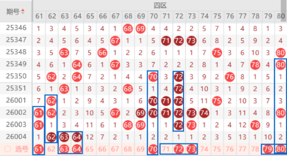 该区间上期开出了62 63 64号数字的三连号,本期我们注意一下出一个重号的情况,其中的63 64号数字可以重点关注一下。本期的71 72 73号数字是属于重号72号数字的边号回补号码,本期是有机会出一个号码的,其中的72 73号数字可以重点关注一下出号情况。该区间的65 77 79号数字都是冷号,又是在同一断区内,本期我们注意一下出一个号码的情况,其中的77 79号数字可以重点关注一下出号情况。