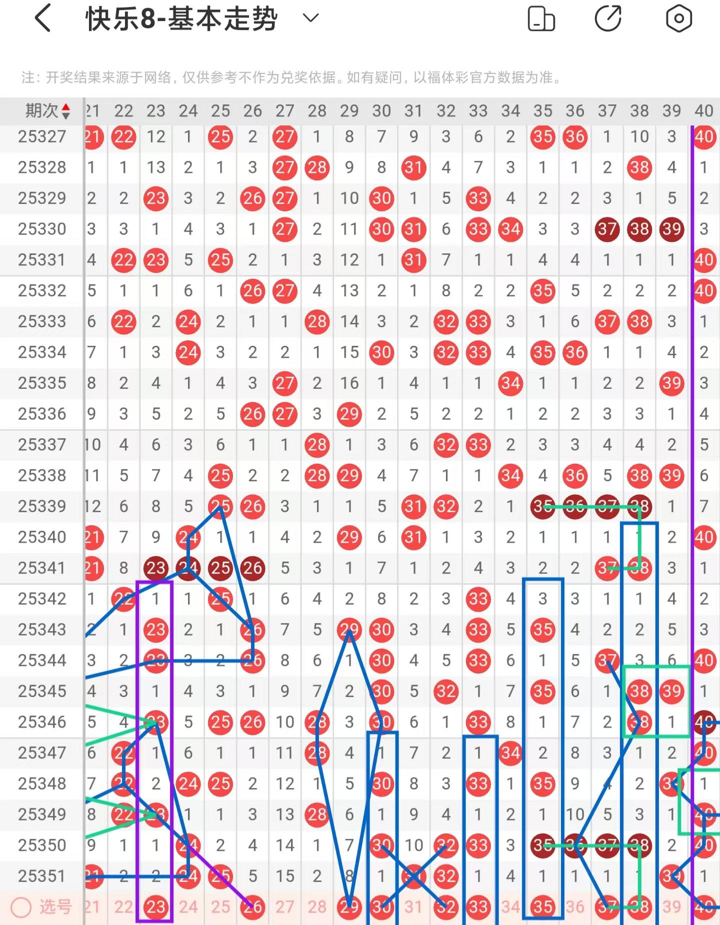 二区间上期小面积减少落号,一共开出六个号码球,本期考虑减少号码球的数量,注意隔期对称回补的23号码球,以及斜连走势回补的26号码球,注意百期相似形态的29号码球,注意隔期对称回补的30、33号码球,注意33号码球也是百期相似形态号码球,注意期数和值加减法的35号码球,防守百期相似形态的37号码球,以35号码球为对称走势起点,注意走势形态的37、38号码球,注意隔期对称回补的38号码球,近期35、36、37、38号码球同期下落,隔期回补37、38号码球,以39号码球为交叉中心点,注意分边落号的38、40号码球,注意期数和值加减法的40号码球,注意近期39、40、41号码球的走势相似,本期注意40号码球,因此二区间关注29-35-37-38-40。注意本区间的选二复式29-35-38。