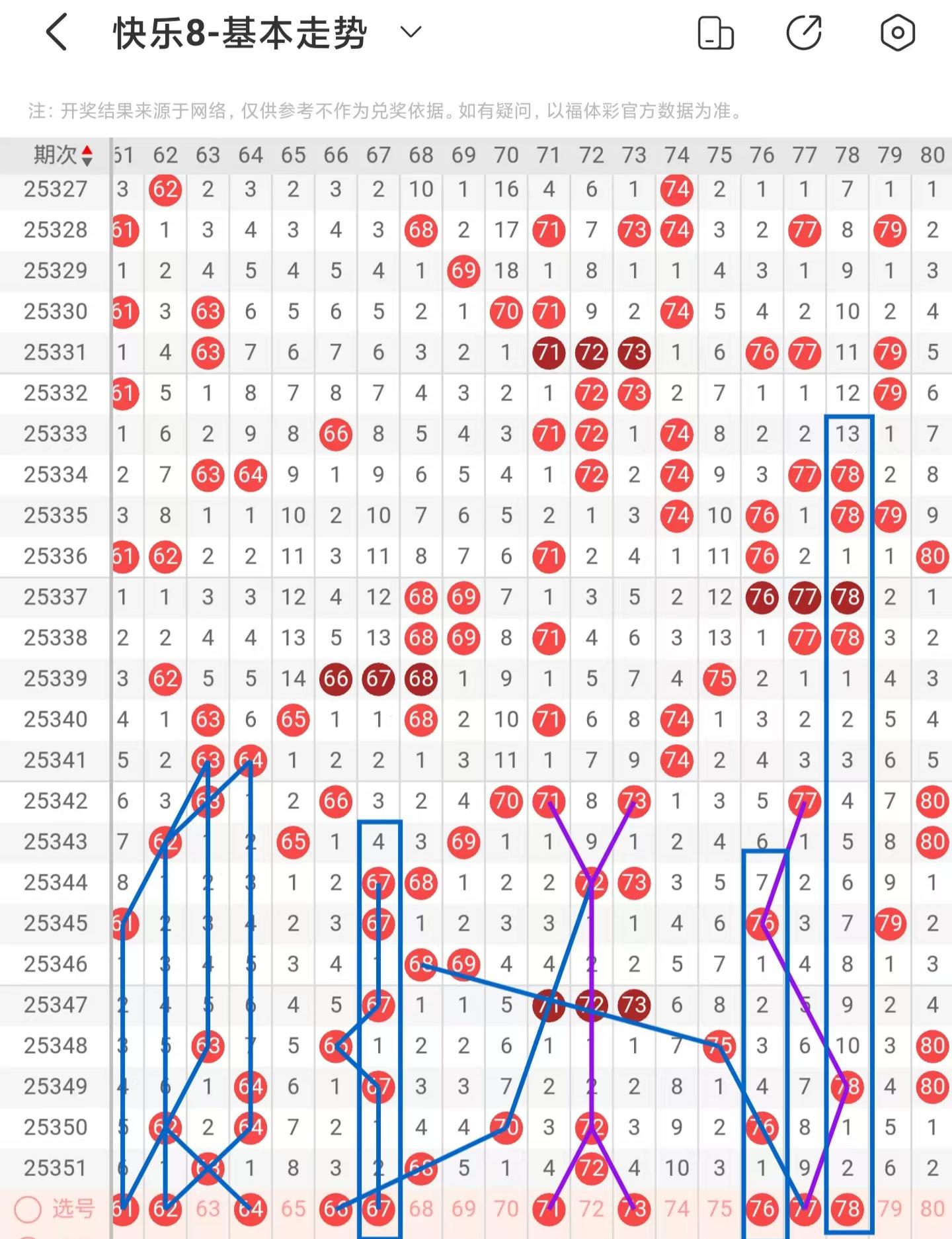 四区间上期小面积减少落号,一共开出三个号码球,本期考虑增加号码球的数量,注意区间的冷热态反复回调,注意斜连走势构成平行四边形形态的61、62号码球,以63号码球为交叉中心点,注意分边落号的62、64号码球,注意斜连走势回补的66号码球,以及期数和值加减法的67号码求,以72号码球为交叉中心点,注意分边落号的71、73号码球,注意隔期递减开出的76号码球,注意斜连走势回补的77号码球,同时也是百期相似形态号码球,注意期数和值加减法的78号码球,因此四区间关注62-67-73-76-78。注意本区间的选二复式67-76-78。