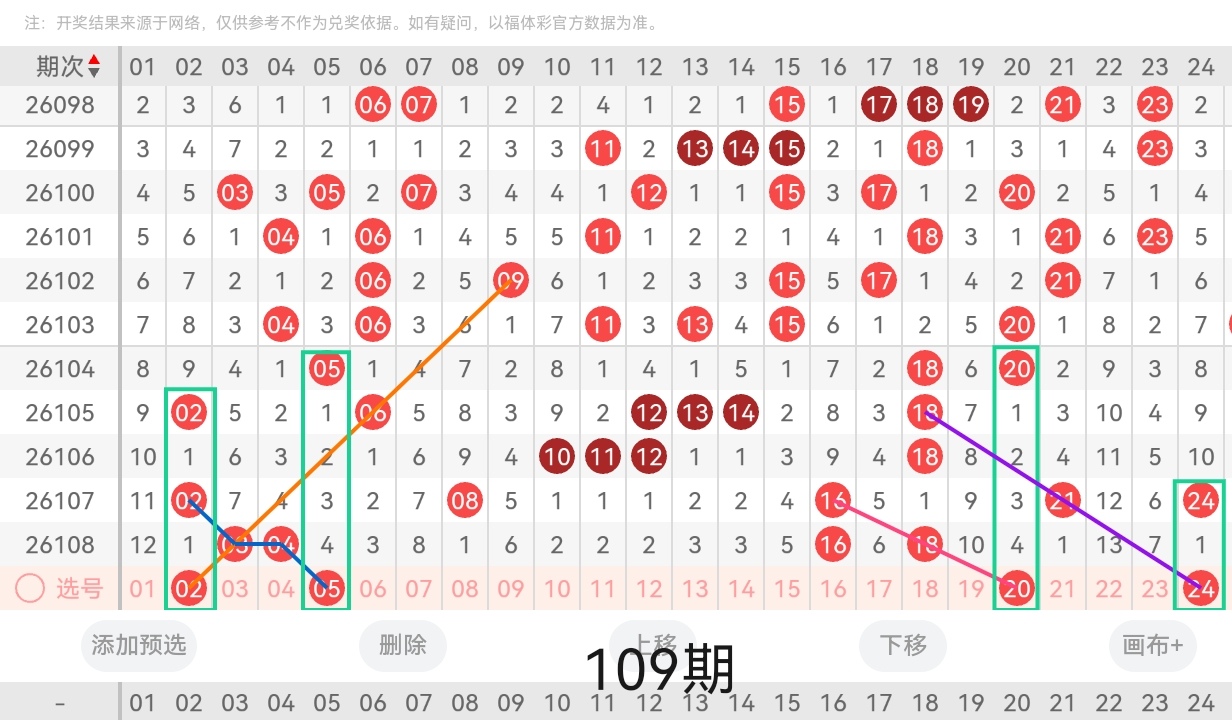 小梁结合上图中的画线思路走势分析得出:号码02与前几期开出的号码呈左斜四连的走位且呈连续隔期回补的走势;号码05与前几期开出的号码呈隔四期回补的走势且呈右斜连的走位;号码20与前几期开出的号码呈右斜三连的走位且呈隔四期回补的走势;号码24与前几期开出的号码呈隔期回补的走势且呈右斜三连的走位。