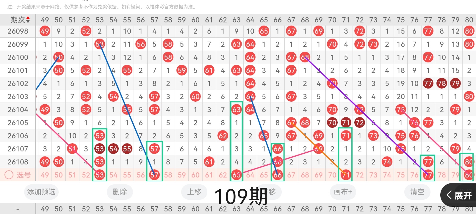 小梁根据上图中的画线思路走势分析:号码53是前几期开出的四重号且与前几期开出的号码呈右斜三连的走位;号码57与前几期开出的号码呈右斜三连的走位且呈隔期回补的走势;号码63与前几期开出的号码呈隔四期回补的走势且呈左斜三连的走位;号码66是前几期开出三重号且与前几期开出的号码呈右斜三连的走势;号码71与前几期开出的号码呈右斜三连的走势且呈隔两期回补的走位;号码77是上期开出的重号且与前几期开出的号码呈右斜五连的走势;号码80是上期开出的重号且与前几期开出的号码呈右斜三连的走位。