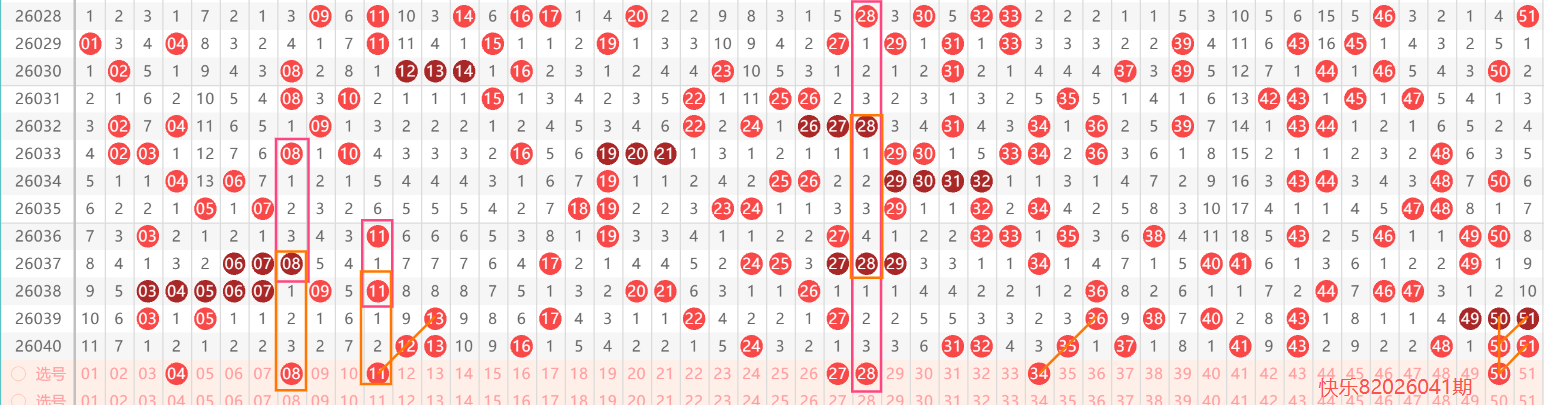 - 区域联动:若热号密集区相邻位置存在号码(如热区"26、27、28、29"搭配号码/25”)此规律选号指向性强。