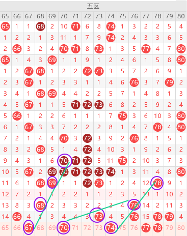 五区胆尾7尾8尾0尾,本期边号65 67 72 74 75 77 78 79 80要出2-3码,重号66 73 76 78 79出一码,形态上80是边号,70是斜连号,上图已勾画,防80不出出70,67 70 74是斜连号,上图已勾画,结论本期关注五码67 70 74 78 79