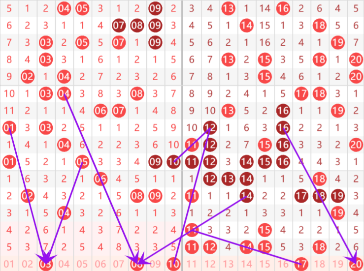 斜连号:与上期开奖号码相邻形成一条斜线的号码。比如上上期开出01,上期开出02,本期开出03,叫做三期斜连号。