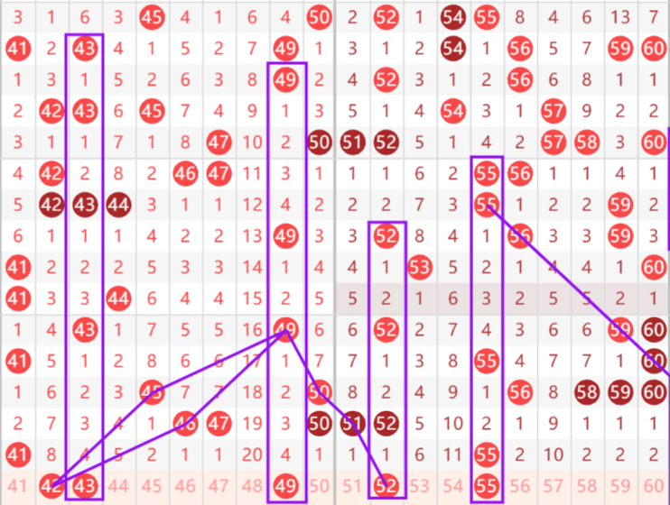 ⭐三区重点号码:43 49 52 55,防守号码:42