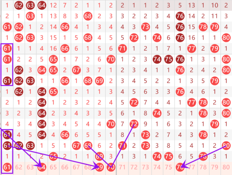 上期四区间开出65 69 74 75 78 五个号码,四区间整体热度上升,本期四区间热度下滑,预计开出号码五个,本期四区间重点号码推荐,重号重点推荐69,邻号重点关注64 76,孤号重点推荐61;