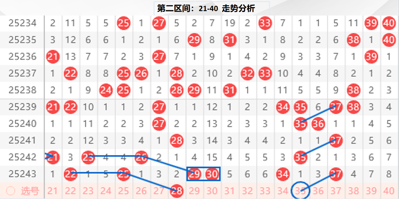二区分析:【21-40】(走势图标注号码非小黄车大底,请谨慎参考,具体思路将在直播间分享讨论)